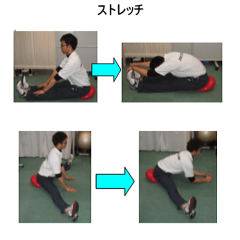 体がかたい人には効果的!・ディスクに座って前屈(太もも内側)ディスクをお尻に敷き開脚する。